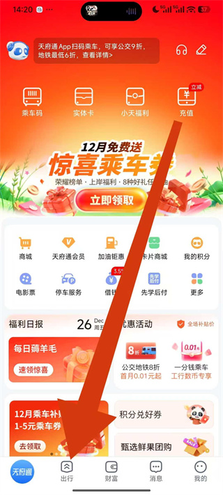1、打开天府通,点击底部导航栏的出行,进入出行功能页面。