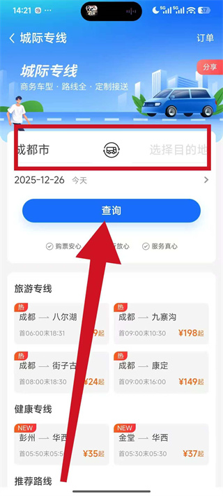 3、在城际专线页面,设置出发地和目标目的地,确认信息后点击查询。
