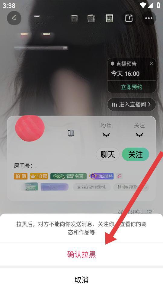 3、当页面弹出拉黑后,对方不能向你发送消息、关注你、查看你的动态和作品等的提示时,点击确认拉黑。