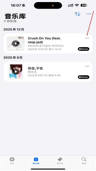 2、在音乐库的页面内,点击音乐右侧三个点的功能按钮。