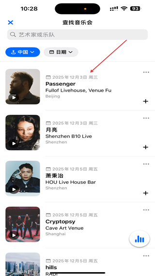 1、启动音乐雷达APP,进入时点击底部音乐会的标签。