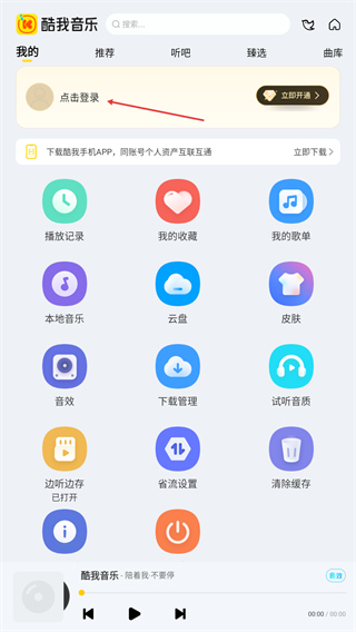 1、在酷我音乐主界面点击左上角我的标签,进入个人中心页面。