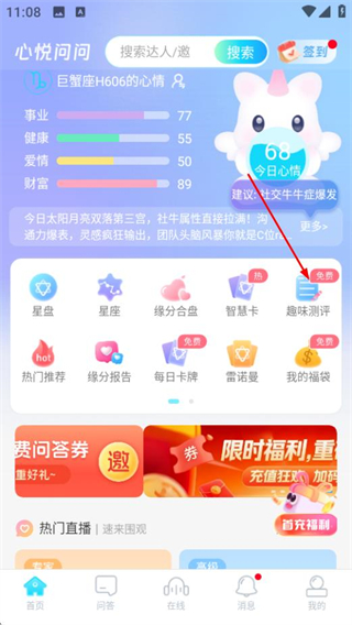 1、在心悦问问首页点击趣味测评选项,进入趣味测评页面。