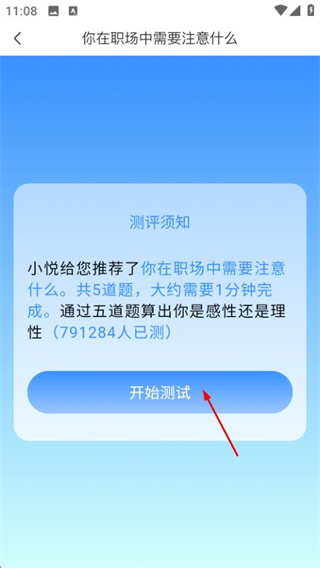 3、在测评须知页点击开始测试按钮,进入测评题目页面。