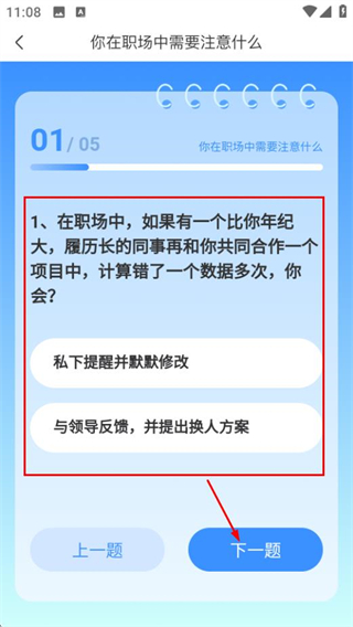 4、在题目页面选择答案后,点击下一题继续做测试。