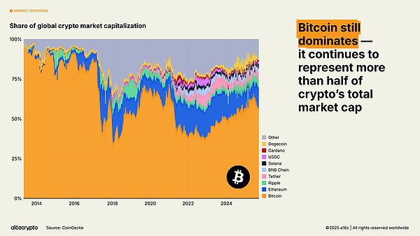 比特币仍占加密货币总市值的一半以上,并创下 12.6 万美元的历史新高,因其作为价值储存手段越来越受到投资者的青睐。与此同时,以太坊和 Solana 收复了 2022 年后的大部分跌幅。