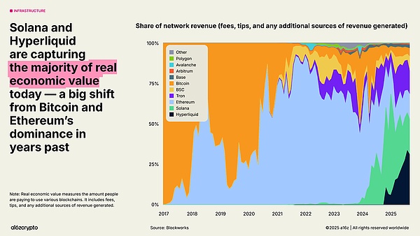 随着区块链规模不断扩大、费用市场日趋成熟以及新应用的涌现,某些指标变得越来越重要;其中之一就是「实际经济价值」——衡量人们实际为使用区块链支付的费用。Hyperliquid 和 Solana 目前占创收经济活动的 53%,与前几年比特币和以太坊的主导地位截然不同。