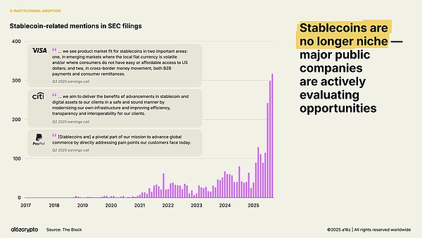 几个月后,Circle 的 10 亿美元 IPO 标志着稳定币发行商成为主流金融机构。7 月,两党共同通过的《GENIUS 法案》获得通过,为稳定币开发者和机构提供了未来发展所需的清晰指引。此后几个月,随着 美 SEC 文件中对稳定币的提及增长 64%,各大金融机构也陆续发布了一系列公告。