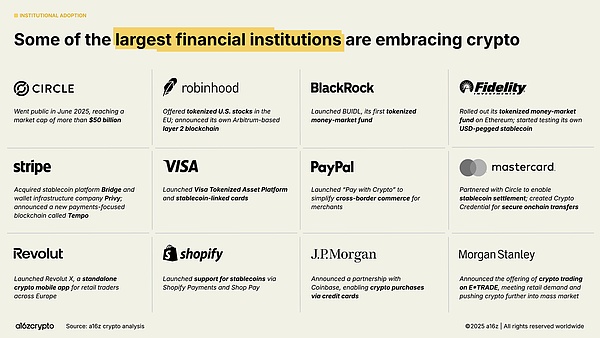 2025 年是机构采用的一年。在去年的《加密货币现状报告》中,Stripe 指出稳定币已找到产品市场契合点,仅仅五天后,Stripe 就宣布有意收购稳定币基础设施平台 Bridge。竞争由此拉开帷幕:传统金融公司也已准备好公开推出稳定币。