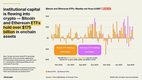 交易所交易产品是机构投资的另一个关键驱动力,目前链上加密货币持有量超过 1750 亿美元,较一年前的 650 亿美元增长了 169%。
