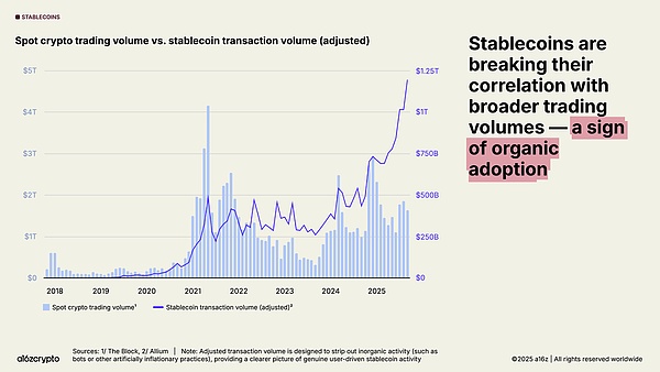 稳定币采用率正在加速增长。月度调整后的稳定币交易量已激增至历史新高,仅在 2025 年 9 月就接近 1.25 万亿美元。