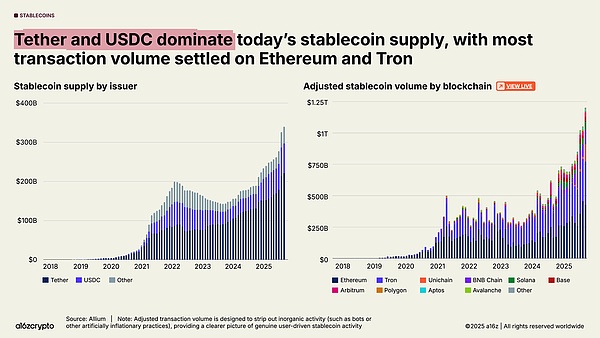 市场上最大的稳定币占据主导地位:Tether 和 USDC 占总供应量的 87%。2025 年 9 月,以太坊和 Tron 区块链上结算的稳定币交易额(经调整)达到 7720 亿美元,占总交易量的 64%。虽然这两个发行商和区块链占据了稳定币交易的绝大部分,但新区块链和新发行商的增长也正在加速中。