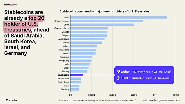 稳定币如今已成为全球宏观经济的一股力量:目前,超过 1% 的美元以代币化的稳定币形式存在于公链上,稳定币持有的美国国债数量也从去年的第 20 位上升至第 17 位。并且,稳定币总计持有超过 1500 亿美元的美国国债,超过了许多主权国家的国债持有量。