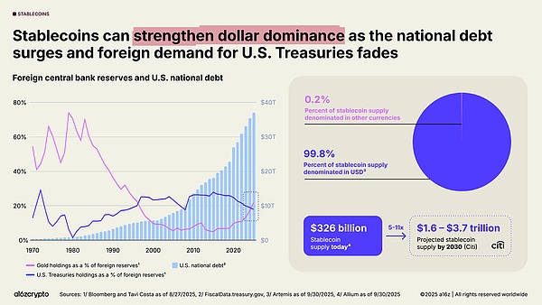 但稳定币却逆势而上:超过 99% 的稳定币以美元计价,预计到 2030 年将增长 10 倍,达到 3 万亿美元以上,为未来几年美国债务带来强劲且可持续的潜在需求来源。即使外国央行减少其国债持有量,稳定币仍在加强美元的主导地位。