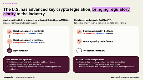 今年,《天才法案》(GENIUS Act)的通过和众议院对《清晰法案》(CLARITY Act)的批准标志着两党达成共识,即加密货币在美国不仅会继续存在,而且有望蓬勃发展。这些法案共同构建了稳定币、市场结构和数字资产监管框架,在创新与投资者保护之间取得平衡。此外,第 14178 号行政命令对该法案进行了补充,该命令推翻了此前的反加密货币指令,并成立了一个跨机构工作组,以推进联邦数字资产政策的现代化。