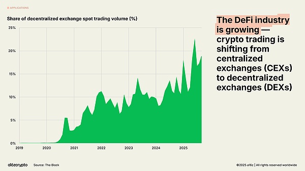 链上经济曾经只是早期尝试者的「小众游乐场」,如今已发展成为一个每月拥有数千万参与者的多领域市场。目前,近五分之一的现货交易量发生在去中心化交易所。