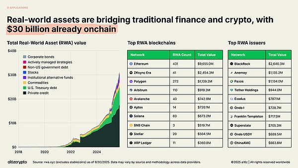 在现实世界资产(RWA)方面,例如美国国债、货币市场基金、私人信贷和房地产等传统资产,在链上呈现代币化——连接着加密货币和传统金融。代币化 RWA 的总市场规模为 300 亿美元,在过去两年中增长了近 4 倍。