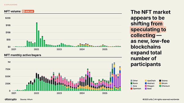 NFT 市场规模远未达到 2022 年的峰值,但月活跃买家数量一直在增长。这些趋势似乎预示着消费者行为正在从投机转向收藏,而这得益于 Solana 和 Base 等跨链平台更廉价的区块空间的出现。