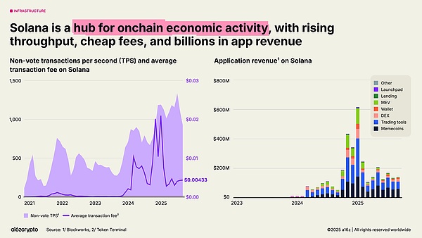 在构建者方面,加密货币仍然是多链的,其中比特币、以太坊(及其 Layer-2)和 Solana 吸引了最多的开发者。以太坊及其 Layer-2 是 2025 年新开发者的首选目的地。与此同时,Solana 是增长最快的生态系统之一,过去两年构建者的兴趣增长了 78%;根据 a16 z 加密货币投资团队的分析,这反映了许多创始人告诉我们他们正在哪个生态系统上构建,或者有兴趣在哪个生态系统上构建。