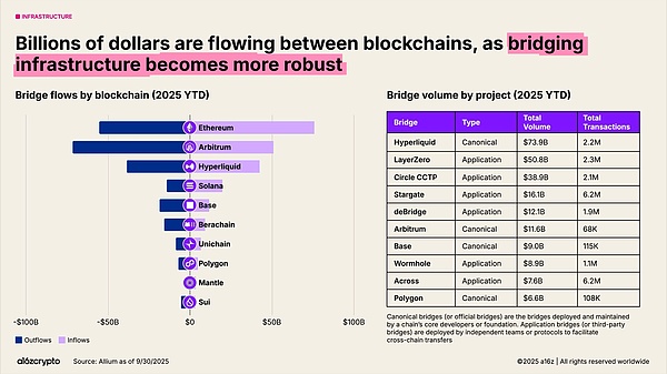 跨链桥使区块链能够互操作。LayerZero 和 Circle 的跨链传输协议等协议允许用户在多链系统之间转移资产。Hyperliquid 的规范跨链桥今年迄今的交易量也已达到 740 亿美元。