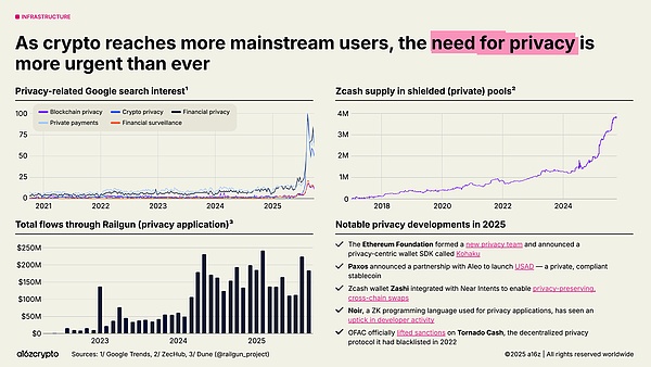 此外,隐私问题正重新成为人们关注的焦点,并可能成为更广泛应用的先决条件。以下指标表明人们对此问题的兴趣日益增长:2025 年,与加密隐私相关的谷歌搜索量激增;Zcash 的屏蔽池供应量增长至近 400 万枚 ZEC;Railgun 的月交易流量超过 2 亿美元。