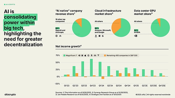 与此同时,人工智能的计算层正在向少数几家科技巨头集中,引发了人们对中心化和审查制度的担忧。OpenAI 和 Anthropic 两家公司控制着「人工智能原生」公司 88% 的收入。亚马逊、微软和谷歌控制着 63% 的云基础设施市场,而英伟达则占据了 94% 的数据中心 GPU 市场。这些不平衡推动了「七巨头」在过去几年中实现了两位数的季度净收入增长,而其余标普 493 指数成分股公司的整体盈利增长却未能跑赢通胀。