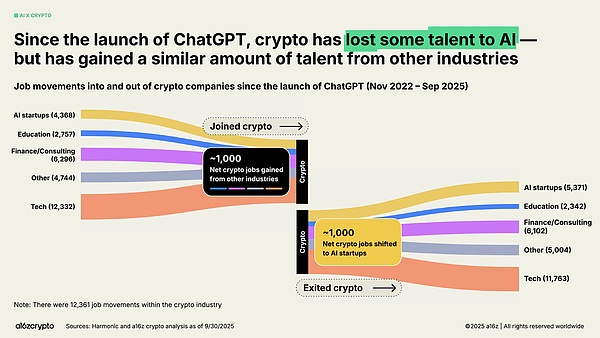 而在人工智能热潮的带动下,一些开发者放弃了加密货币领域。a16z 分析表明,自 ChatGPT 推出以来,约有 1000 个工作岗位从加密货币领域转向了人工智能。不过,这一数字被同样数量的开发者从其他领域(例如传统金融和科技)加入加密货币领域所抵消。