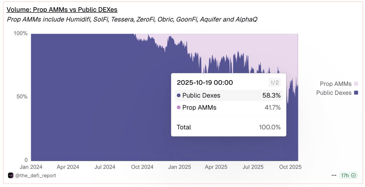 专业自动做市商(Proprietary AMMs,简称 Prop AMMs)正在迅速成为 Solana DeFi 生态中的主导力量,目前它们已经贡献了主要交易对中超过 40% 的交易量。这类由专业做市商运营的专门流动性场所,能够提供深度流动性和更具竞争力的定价,核心原因在于它们显著降低了做市商被利用「过期报价」(stale quotes)进行抢跑(front-running)套利的风险。