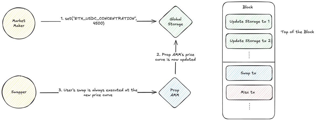 Uniswap 团队的 @MarkToda 提出了一种新方法,通过全球存储智能合约 + 专门的区块构建器策略实现: