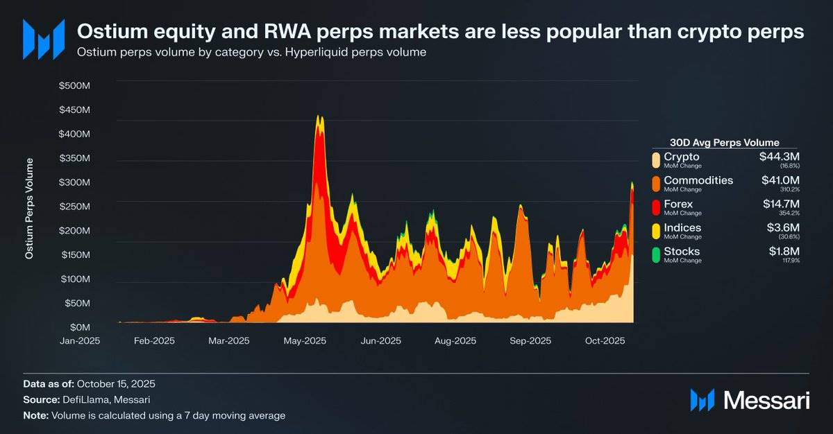 例如,Ostium 平台的日均股票永续合约交易量仅为 180 万美元,而加密货币永续合约的交易量则高达 4430 万美元,显示出市场需求较弱。