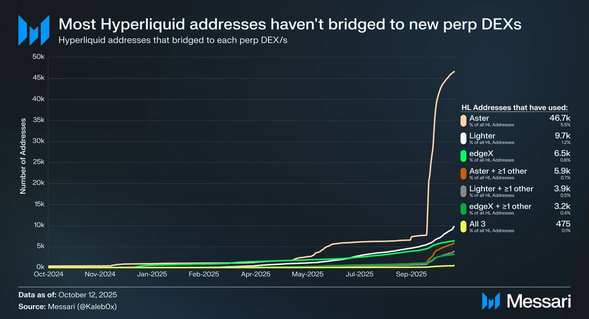 让我们探讨在 Hyperliquid 的 HIP-3 升级背景下,股票永续合约可能的发展方向。HIP-3 引入了去许可的永续合约市场,而数据显示,少于 10% 的 Hyperliquid 地址已桥接至 Aster、Lighter 和 edgeX,甚至更少用户选择了多个永续合约去中心化交易平台(DEX)。这表明 Hyperliquid 的资金具有粘性,且质量较高。基于此数据,可以从两个角度预测股票永续合约的未来: