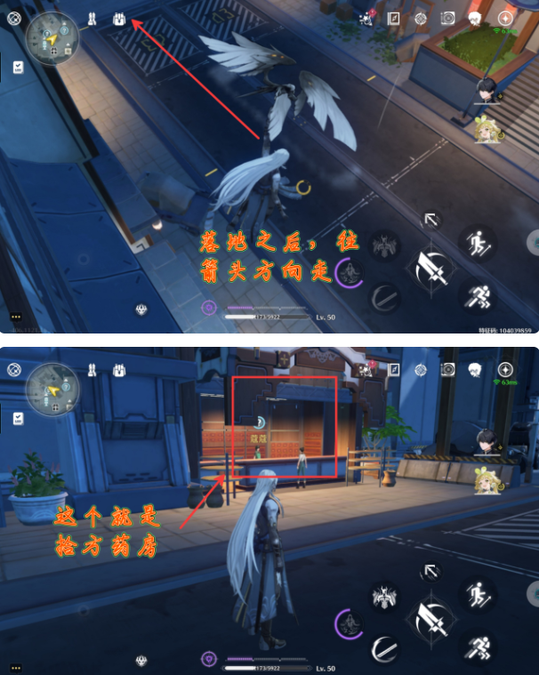 3、落地之后,往箭头方向走,然后就可以看到有【拾方药房】了。