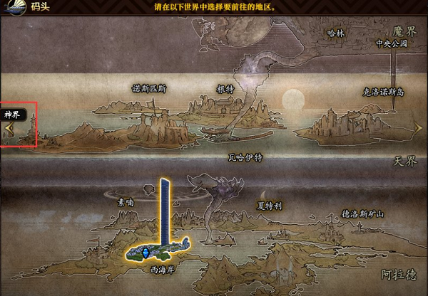 新增新区域神界,如果通过西海岸港口前往,则需要点击左侧新增的按钮。
