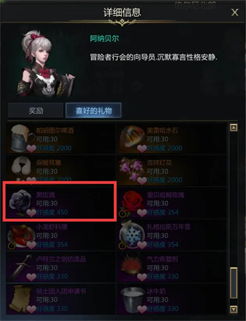 喜欢的礼物:黑玫瑰+450,该礼物可以在卢特兰西部的流浪商人处购买获得;