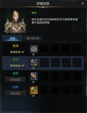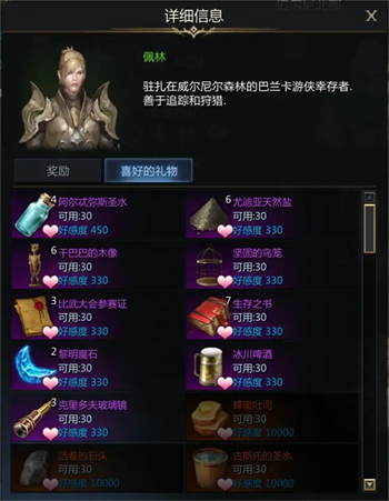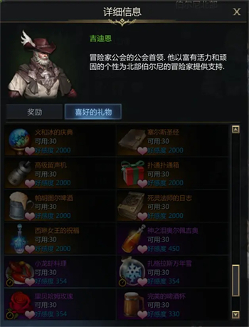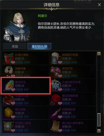 喜欢的礼物:精灵羽毛+450,该礼物可以通过罗亨达尔流浪商人处购买获得;