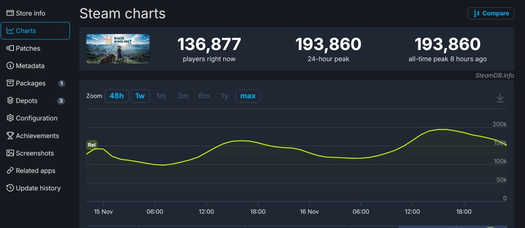 目前游戏已在PC(Steam、Epic*G*ames*S*tore)和PS5平台开放免费下载。根据第三方数据平台SteamDB统计,游戏在Steam平台的实时在线人数峰值已突破19.3万,展现出强劲的市场表现力。