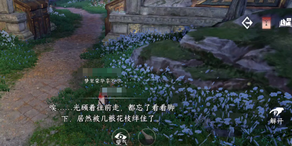 完成初始剧情后,玩家会被传送到室外场景。此时需要移动至【1703,241】位置,解开缠绕在角色脚踝的【花枝】束缚,这个细节设计展现了游戏场景交互的精致之处。