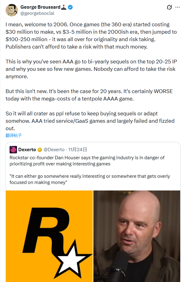 这番讨论源于《毁灭公爵》联合创始人乔治·布鲁萨德对Rockstar联合创始人丹·豪瑟观点的回应。豪瑟此前曾表示,游戏产业可能"走向真正有趣的方向,也可能过度聚焦于赚钱"。布鲁萨德则认为这种现象并不新鲜,并指出:"一旦游戏(Xbox 360时代)开发成本从2000年左右的300-500万美元增至3000万美元,随后又跃升至1-2.5亿美元——原创性和风险承担就终结了"。他强调,发行商无法承担如此巨大的资金风险,这导致3A级作品集中在20-25个顶级IP上,且续作频出,全新游戏寥寥无几。