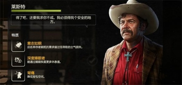 意志如钢:这名幸存者能抵抗需求值过低导致的士气损失,在资源匮乏时期表现尤为突出。