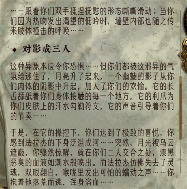 若选择纵欲卡作为钥匙,必须确保随行人员具备"激情"特质。这个特殊要求往往被新手玩家忽略,导致多次尝试都无法成功进入。