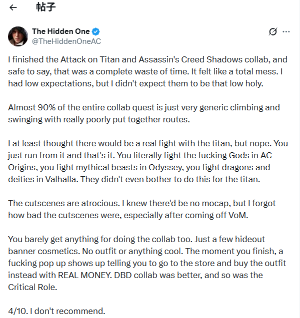 玩家TheHiddenOneAC对《进击的巨人》联动任务表达了强烈不满:"这根本是时间陷阱,90%内容都是重复的攀爬动作,设计粗糙得令人震惊。"更让他失望的是期待中的巨人战斗完全缺席,这种处理方式与系列以往神话元素的表现形成巨大反差。