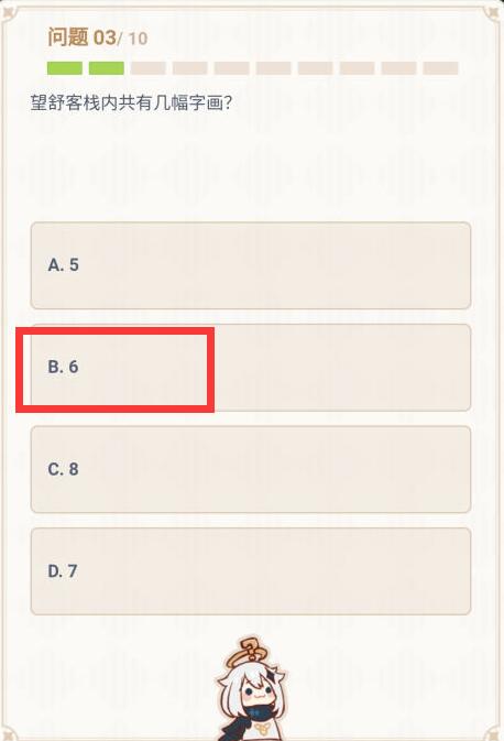 原神中派蒙有一题:望舒客栈内有几幅字画?这道题考验玩家对字画数量的了解,需要有敏锐的观察能力。