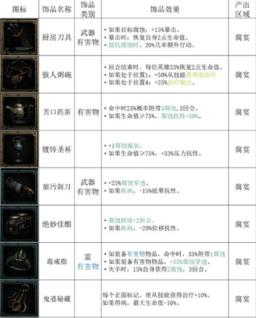 腐宴的专属饰品,主要分为提高生命回复量,以及腐蚀效果相关的饰品。