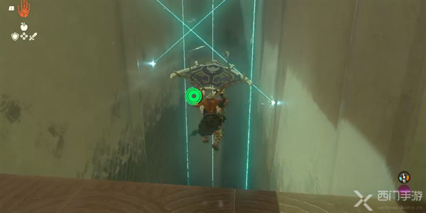步骤二:平台右侧存在隐藏气流通道,滑翔时按住左摇杆微调方向,激光阵列的间隔规律为三短一长,建议在长间隔周期通过。