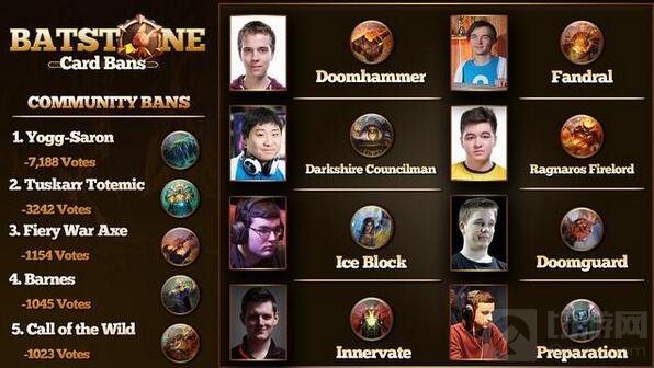Batstone采用了创新的双轨禁卡制:观众票选5张禁卡,8名选手各禁1张,最终13张卡牌被移出比赛。被禁名单中,尤格萨隆以压倒性优势位居榜首,海象人图腾师、兽群呼唤等超模卡紧随其后。这种赛制有效降低了随机性对比赛的影响,让选手的构筑能力与临场决策成为胜负关键。