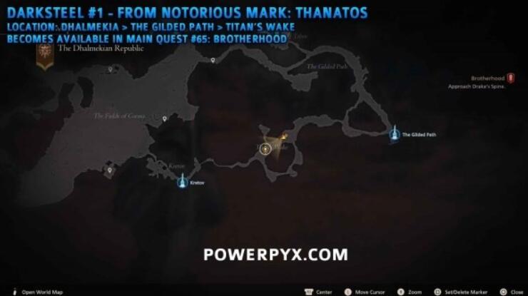 在达尔梅奇亚的泰坦之路峡谷,死神【塔纳托斯】的镰刀每完成三次旋转就会掉落黑钢碎片。保持中距离作战可避免被其死亡印记锁定。