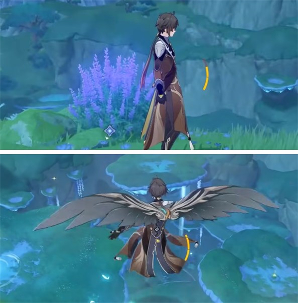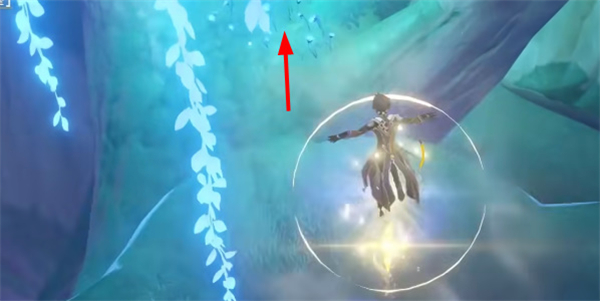 2、到达传送位置后,我们将视角拉到左侧花的位置,然后朝着花所在的方向跳下去,然后一直往前飞。