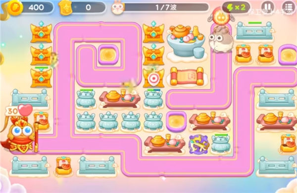 2、中期重点清理路线中央道具,并在道路拐角处集中部署船锚炮塔。建议将50%金币用于新建炮塔,剩余资金优先升级已有防御设施。