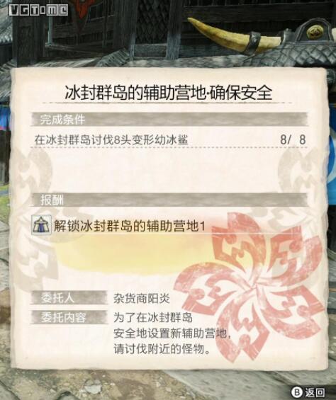 解锁条件:解锁条件是在冰封群岛讨伐 8 头变形幼冰鲨。