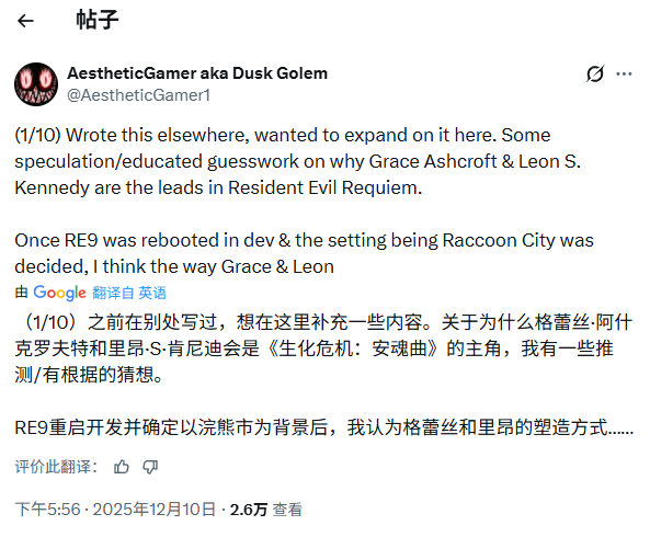 在一段长篇推文中,爆料者Dusk Golem表示,新角色格蕾丝将为玩家呈现关于浣熊市事件的全新视角——这是《生化危机》系列中最关键的事件之一。这也被视为一种"软重启",便于新玩家了解系列背景。许多从未玩过旧作的玩家对浣熊市事件知之甚少,而格蕾丝的视角将帮助他们以"第一次见证恐怖"的方式体验剧情。